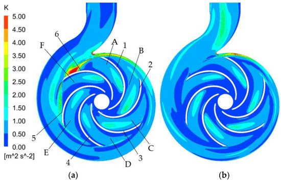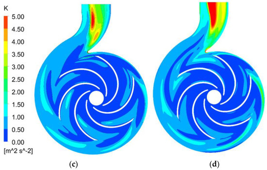 Different intensifications of turbulence can be found in the pump while it operates under various flow rates. The distributions of the turbulent kinetic energy in axial plane b are shown in Figure 15. It is clear that the distribution of the turbulent kinetic energy is relatively uniform and symmetric when the flow rate increases from 0.8 Qd to 1.2 Qd, which illustrates that the intensity of turbulence is weak. The turbulence intensity in the local region near the pump outlet is relatively strong with Q increases to 1.2 Qd. The water velocity drops gradually with the decrease of Q, causing the gradual increase of the turbulence intensity. When the flow rate is 0.8 Qd, a relatively strong turbulent region is produced near the narrow gap between the volute tongue and the blades as shown in Figure 15b. The region of the turbulence expands, and the intensity of the turbulence intensifies, with the further drops of the flow rate.