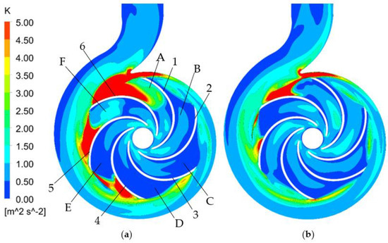 Turbulent kinetic energy distribution in axial plane b under part load conditions. (a) 0.2Qd, (b) 0.4 Qd.