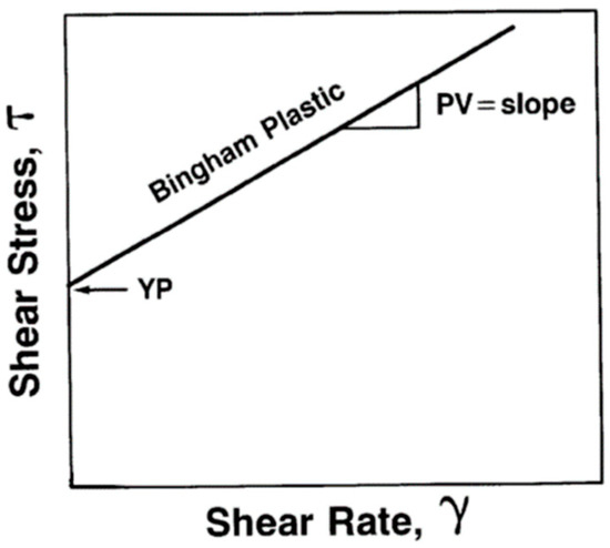 Drilling fluids can be classified into two main groups: Newtonian fluids and non-Newtonian fluids [3]. Viscosity is independent of the shear rate in Newtonian fluids, while it is a function of the shear rate in non-Newtonian fluids. Apparent viscosity and the other rheological properties (i.e., plastic viscosity, yield point, and gel strengths) of non-Newtonian drilling fluids are measured in the oil industry using the Bingham Plastic mathematical rheological model [28,29]. All above rheological properties are calculated from VG meter readings (i.e., R300 and R600). In the Bingham Plastic model, it is assumed that the curve of shear stress vs. the shear rate is a straight line, which should not cross the origin (i.e., the curve intercept point with the shear stress, which is called the yield point, should be more than zero) (Figure 1) [30]. The Bingham Plastic model uses the following equations: