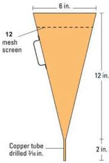 The marsh Funnel viscosity represents the time in seconds that it takes a quart of fluid (1500 mL) to flow out of a cone via a short cylinder into a graduated cup (Figure 2) [31]. Marsh funnel viscosity is a direct indication of the overall viscosity of drilling mud. The standard Marsh funnel viscosity of water is approximately 26 s.