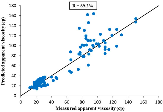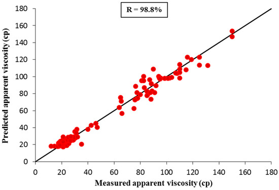 Cross-plot of the measured (experimental) and predicted apparent viscosity from the newly developed correlation.