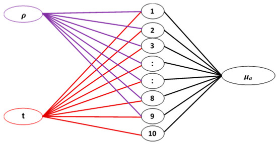 Schematic diagram of artificial neural network topology used for the apparent viscosity (μa) prediction model as a function of mud density (ρ) and march funnel viscosity (t).