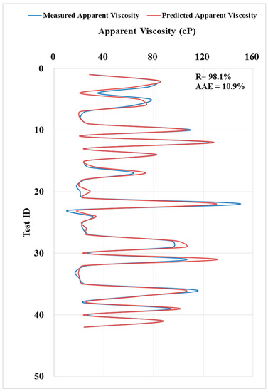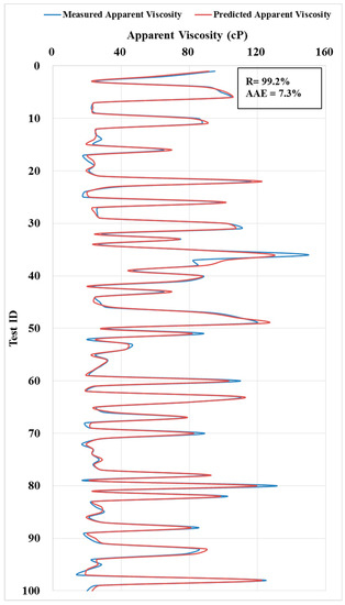 Figure 8 presents the log for the measured and the predicted apparent viscosity from the newly developed ANN for the training data (100 samples). It is clear that the new ANN model is able to determine the apparent viscosity with an average absolute error (AAE) of 7.3% and a correlation coefficient (R) of 99.2%, when the measured and predicted lithology is compared. After the training process, the model is tested using unseen samples during the training process (42 samples). The result of the testing process is shown in Figure 9 and Table 3. It is obvious that the new ANN model is able to predict apparent viscosity with good accuracy (R = 98.1 and AAE = 10.9%).