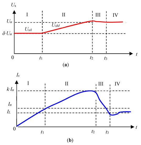 In Figure 1, Un, In, IL, Us and Is stand for the nominal voltage, rated current, load current, starting voltage, and starting current of the high-voltage and high-power motor, respectively. I, II, III, and IV denote the four stages for AVRCLS with RPC, MVRCLS with RPC, termination of starting, and power filtering. t1, t2, and t3 represent the switching time of the MVRCLS subsystem, full voltage run, and power filtering subsystem respectively. UsA and UsM are output voltages of the AVRCLS subsystem and MVRCLS subsystem, respectively. The starting current times k was the control object, generally in the range of 2–4.
