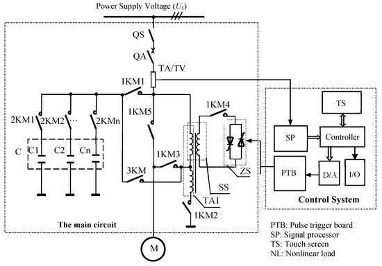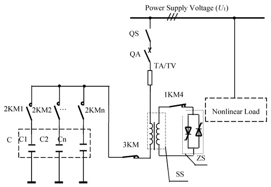 Based on the research findings [28,29,30,31,32] and according to the above current-limiting starting characteristic curve, a device was developed which integrated current-limiting starting, reactive compensation, and harmonic filtering (hereinafter referred to as integrated device). The topological structure of the integrated device is shown in Figure 2.