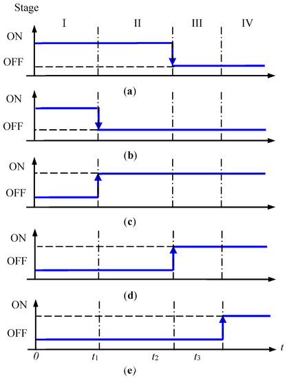 In Figure 3, ‘ON’ meant the high-voltage contactor was closed, while ‘OFF’ meant it was open. In stage I (0~t1), the AVRCLS subsystem was turned on; in stage II (t1~t2), the MVRCLS subsystem was turned on; in stage III (t2~t3), the soft starting process of the high-voltage and high-power motor terminated; and in stage IV (t3~), the power filtering subsystem was turned on.