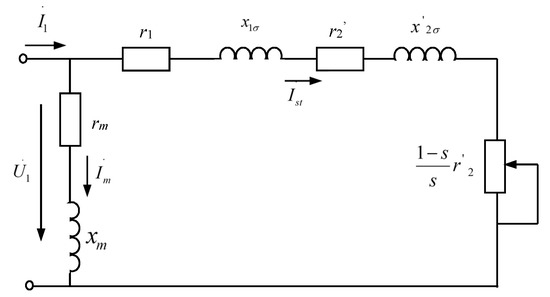 In Figure 4, r1 and x1σ are the stator resistance and stator leakage reactance of the motor, respectively. rm and xm are the excitation resistance and excitation reactance of the motor, respectively. and are the converted values of rotor resistance and leakage resistance of the motor respectively. U1 is the root mean square (RMS) of power supply voltage. s is the slip ratio. is the mechanical analog resistance.