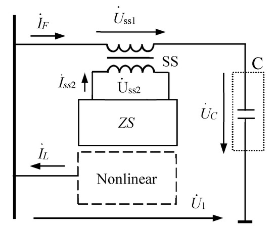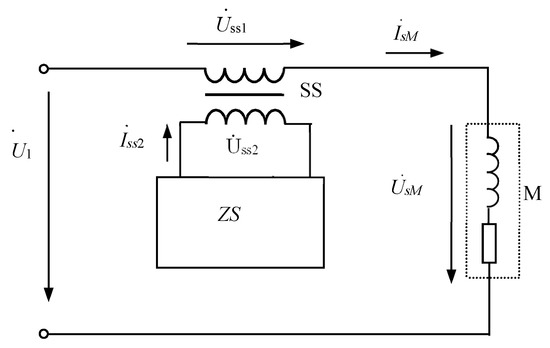 As shown in Figure 8, the high-voltage winding of SS was the primary side, with Nss1 as the number of turns, Uss1 as the voltage and Iss1 as the current. The high-voltage winding and the motor (voltage: US) were connected in series. Similarly, the low-voltage winding of SS was the secondary side, with Nss2 as the number of turns, Uss2 as the voltage and Iss2 as the current. The low-voltage winding and ZS were also connected in series.