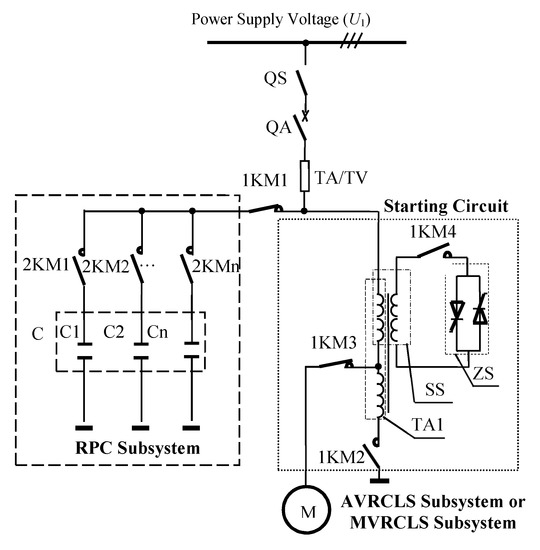 As shown in Figure 2, QS is a disconnector, QA is a high-voltage circuit-breaker, TA/TV is a current/voltage transformer, TA1 is an autotransformer, SS is a magnetic control reactance transformer, ZS is an impedance transformer, C is a capacitor bank composed of several compensation capacitors (C1, C2,…, Cn), and M is the high-voltage and high-power motor. 1KM1~1KM5, 2KM1-n, and 3KM are high-voltage contactors.