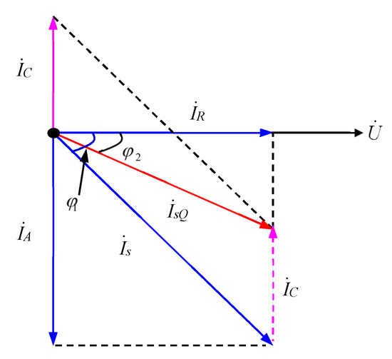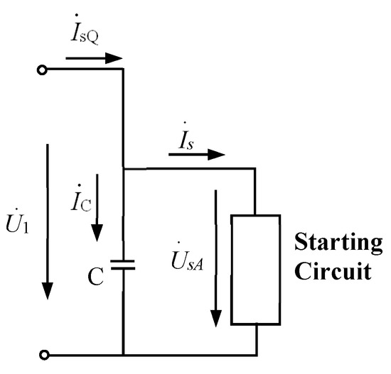 The high-voltage and high-power motor was a kind of inductive load which could reduce the voltage of power grid by establishing a magnetic field and consuming considerable reactive power. During the starting process of the motor, the power factor gradually increased along with the speed. The compensation capacitor C was connected in parallel with the starting circuit to provide reactive power, which greatly reduced the total current absorbed from the power grid when the motor started. The topological structure and equivalent circuit model of the RPC subsystem are shown in Figure 10 and Figure 11, respectively [27].