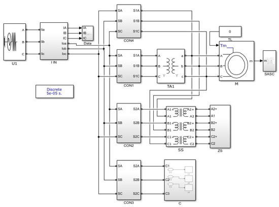 Three-Phase Source block with 10 kV/50 Hz in Simulink was selected as the power supply voltage (U1). Asynchronous Machine block was selected as the motor whose parameters are listed in Table 1.
