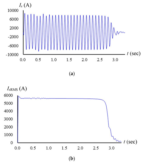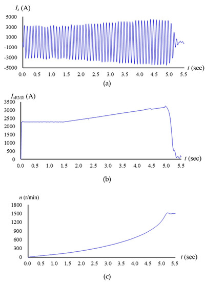 It could be known from Figure 17a,b that the maximum starting current reached 5627 A, which was about 4.6 times that of the rated current (1253 A). Therefore, the power grid of the motor might be damaged.