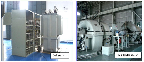 With a 10 kV/19,000 kW fan-loaded motor of a steel plant as the subject of the study, a current-limiting soft starter with RPC was designed based on the theoretical findings. The soft starter was manufactured by Dayu Electric Technology Co., Ltd. The fan-loaded motor is shown in Figure 19.