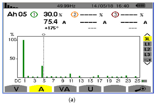 (1) Before filtering (Figure 20a), the 5th harmonic current and its THD of nonlinear load were 75.4 A and 30.0%, respectively.