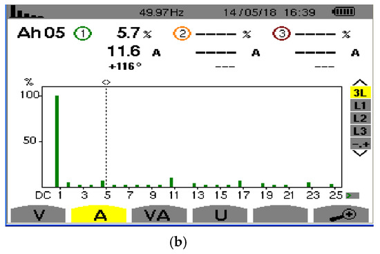 (a) I5 and total harmonic distortion (THD) before filtering; (b) I5 and THD after filtering.