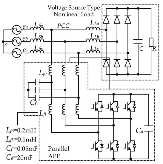 Figure 1 shows the system main circuit structure of a parallel APF compensation voltage source type nonlinear load, where LL is the impedance of the AC side of load and LS is the equivalent impedance of the system side. LS mainly includes two parts, namely the leakage inductance of the power transformer and the equivalent impedance of the transmission line. The structure in the dashed box in Figure 1 shows the typical resistance–capacitance uncontrolled rectifier nonlinear load.