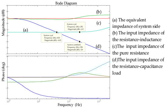 According to Figure 4, with the increase of frequency, the input impedance of the resistance–capacitance load’s uncontrolled rectifier decreased rapidly, while the input impedance of the resistance–inductance and pure resistance uncontrolled rectifier changed very little and showed an upward trend. At this time, the input impedance of the resistance–capacitance load was −20 dB, the equivalent impedance of the system side was −4.2 dB, and the AC input impedance of the resistance–capacitance load was much smaller than the equivalent impedance of the system side. Moreover, with the increase in frequency, the equivalent impedance of the system side was larger and the AC input impedance was smaller. However, the pure resistance and resistance–inductance uncontrolled rectifier were opposite.