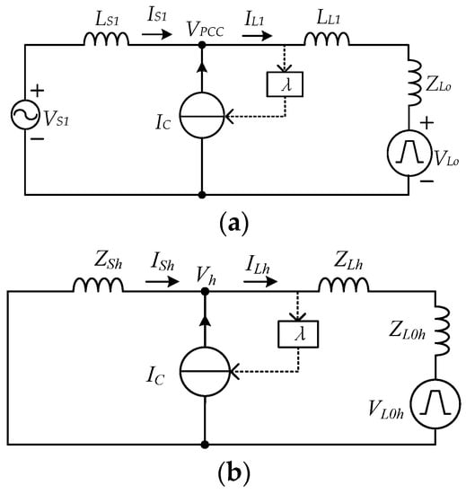 For the convenience of analysis, when only equivalent circuits at harmonic frequencies are studied, it is assumed that the power supply voltage does not contain harmonic components, the power grid is equivalent to a short circuit for harmonic frequencies, and the load is replaced by a single harmonic voltage source VLoh, so a single-phase equivalent circuit is as shown in Figure 5b. The analysis can be divided into the following situations:
