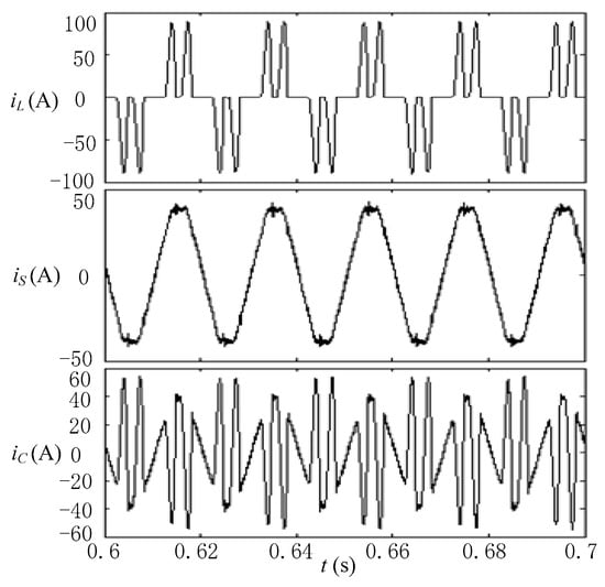 Figure 11 shows the dynamic waveform of the parallel APF compensation voltage source type nonlinear load when the series inductance LL = 50 μH on the AC side of the load. The load current, system current, and APF compensation current were sequential from top to bottom. The parallel APF started to output compensation current at 0.15 s, the peak load current gradually increased from 82 A to 108 A, and the THD increased from 92.74 to 115.05%. Due to the small series inductance, the amplification effect of the load harmonic current after compensation was obvious and the compensation effect was not good, with the system current THD after compensation being 12.42%.