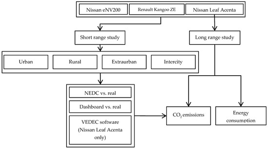 The objective of this research was to analyse real working parameters and energy consumption considering road types, speeds, distances and weather conditions. The research also analysed the CO2 emissions of different driving cycles and the effect of the energy generation mix on the emissions. Figure 1 shows the main steps of the methodology.