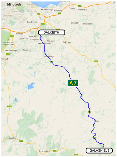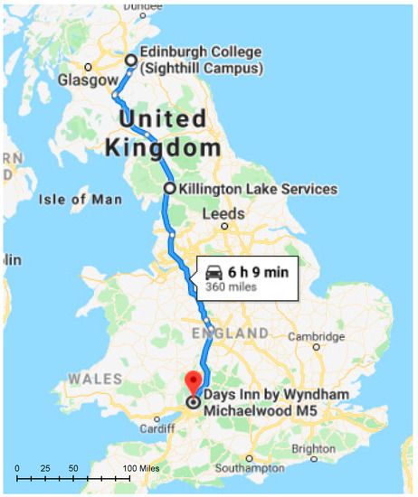 The journey was conducted over several days through the A701-M74-M6-M5 main route from Edinburgh to Bristol, which includes a rapid chargers network known as the “Ecotricity electric highway” [53]. The trip was divided into different sectors, so the effect and dependence of the elevation and road conditions could also be studied, and the energy consumption on different terrains could be compared with internal combustion engine (ICE) vehicles. Figure 4 shows the distance of the test.