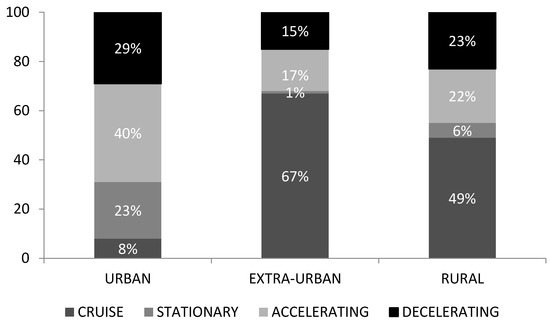 The test route this time included urban, extra-urban and rural areas, with the aim of identifying factors determined by acceleration and speed that were unique for a specific route type. For this purpose, the car was charged to 100% energy level and driven to the destination, recording the energy consumption. Once arrived at the destination, the car was recharged. Distance, journey duration and charge duration were also recorded. Figure 3 shows the mobility activity (%) of the test vehicle on each type of road, showing the percentages of time the vehicle was accelerating, decelerating, at a constant speed (cruise) or stationary. The results were different depending on the road type. In the extra-urban route for example, due to the dual-carriageway nature of the road, higher and more constant speeds were reached, and therefore the cruise section was larger. The amount of time spent in each mobility activity directly affected the energy consumption.