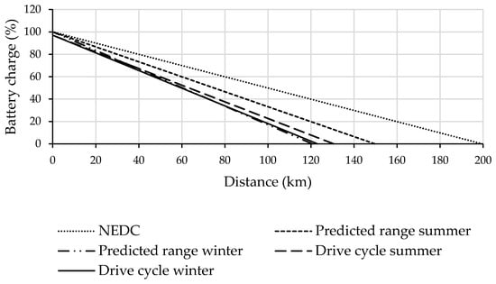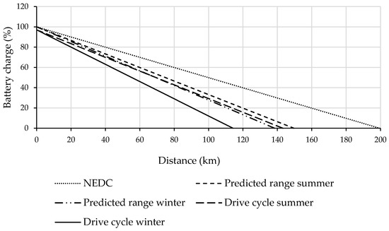 The results of this study indicate that the data provided by the manufacturers (NEDC) and the values shown in the vehicle’s dashboard are inaccurate, and far from being accurate. The values shown in the dashboards of the vehicles were, in most cases, 30% lower than the theoretical values according to the manufacturers (NEDC). The difference between the dashboard values and real mileage range was as high as 13% in some cases. The gap between the estimated values and the real range of the vehicle was larger during the winter, with differences up to 17% in some cases. The Nissan Leaf vehicle had 20% less autonomy during winter for the same extra-urban route. This explains the fact that there is a decrease in use of the electric vehicles in winter.