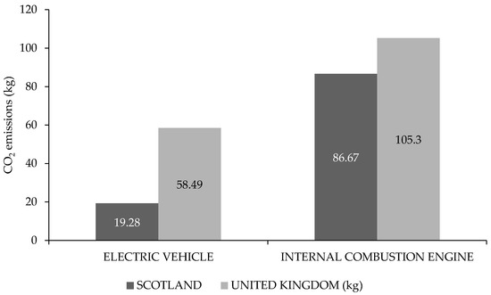 The results prove that the switch from internal combustion engines to electric vehicles is essential to achieve a more sustainable transport. Nevertheless, electric vehicles are not free from emissions, and the numbers shown in Figure 12 show their dependency on the grid. Scotland is very focused on the achievement of 100% non-fossil-fuel electricity by 2020. Currently, when an electric vehicle is charged in Scotland, it emits 5.7 times less CO2 than an ICE vehicle. In England, the dependency on fossil fuels is much larger, and it reduces 2.3 times the emissions of a conventional vehicle.