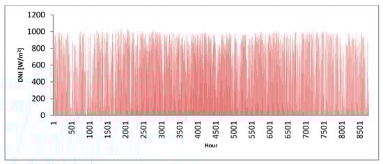 Hourly direct normal irradiance (DNI) for the region (www.soda-pro.com).