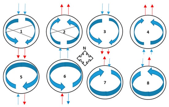 Top view for the eight alternative flow patterns of the heat transfer fluid [14].