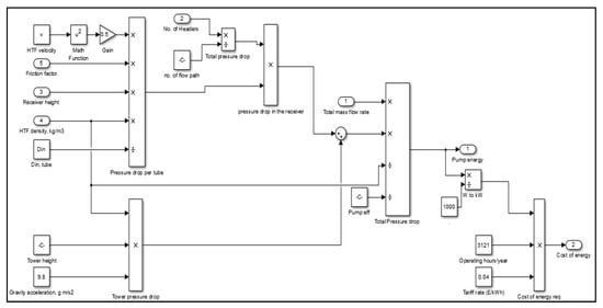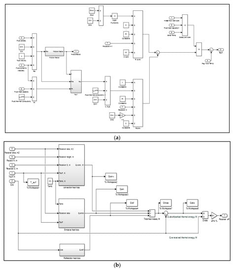 Maximum number of tubes per receiver is related to the tube diameter and the receiver diameter. Thus, the maximum number (Dre = 7.5 m and dout = 20 mm) is approximately 1178 tubes. However, the model result for the total number of tubes is 1200 tubes, which is more than the maximum. Therefore, the next higher size of tube diameter, 25 mm, was used to decrease the total number of tubes; see Table 7. The maximum number of tubes for a 25 mm receiver tube is 942 tubes. Simulink model shows that the total number of tubes should be is 868 tubes per receiver, which is below the maximum tube number (942 tubes). Furthermore, it was observed that a small tube thickness can lead to higher receiver efficiency. Thus, a tube thickness of 1 mm was used in this simulation model.