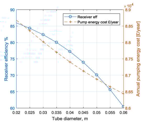 After adjusting tube diameter and thickness, the receiver efficiency and the annual cost of pumping power were recomputed as 85% and 90,721 £/year, respectively.