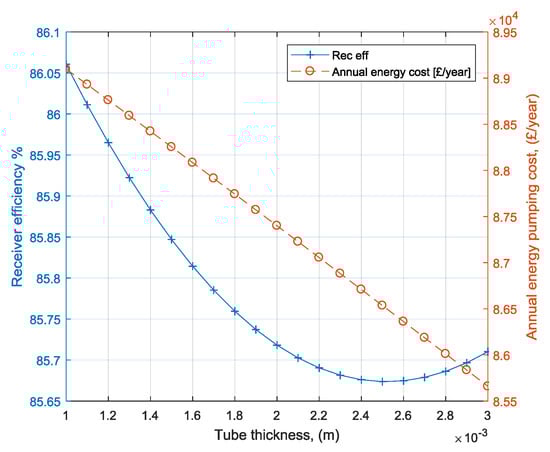 For the energy cost analysis, the cost of pumping HTF to the receiver decreases linearly with tube thickness (Figure 16). The proposed tube thickness’ range has a moderate effect on the annual cost of energy. The difference in cost between the minimum and maximum tube thickness is around £3500 per year. However, at 1 mm tube thickness, the receiver efficiency is greater than the largest tube thickness by approximately 0.4%, which equals about 600 kWth thermal energy. Then, the smallest tube thickness for a molten salt external receiver has a low heat loss and provides more thermal energy, which minimises the cost of pumping power.