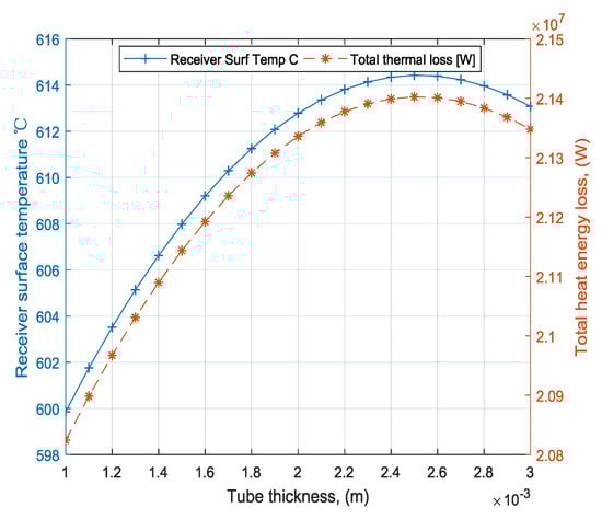 The impact of tube thickness on receiver efficiency and annual energy cost are shown in Figure 15. Two different regions for tube thickness are depicted. The first region corresponds to a tube thickness between 1 mm and 2.5 mm. In this region, the receiver efficiency decreases exponentially with increasing tube thickness. This could be explained by Figure 16, where receiver temperature increases with the same pattern. In the second region, which is for tube thickness above 2.5 mm, the receiver efficiency starts to increase slightly. This is possibly due to the assumption of a fixed fluid speed. The fluid speed should increase when the inner tube diameter is decreased. Therefore, the effect of this assumption starts to be noticed when the tube thickness is greater than 2.5 mm. It can be concluded that the receiver efficiency at a small tube thickness is higher than at a large thickness.