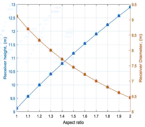 where Dre and Hre are the diameter and the height of the receiver, respectively. To add the aspect ratio (AR) term into the above equation, the receiver area can be rewritten as shown in Equation (11):
