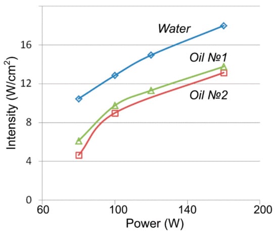 The authors of similar works give data on the intensity of ultrasonic treatment of oil calculated for water [42,43]. However, as our calculations show, this approach is approximate. The error of this assumption depends on the rheological and physicochemical properties of crude oil. For the oil samples No. 1 and No. 2 considered in this paper, the average deviation of the values with respect to water was 27.0% and 37.5%, respectively (Figure 1).
