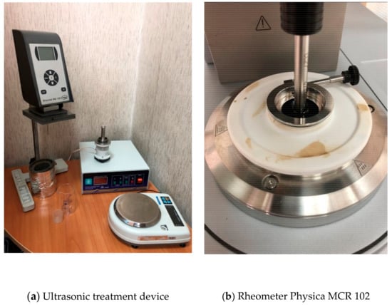 The results of the study [44] show that the viscosity of liquids decreases under the influence of ultrasound, and it can be explained by heating and cavitation in the liquid. In this paper, the recommendations set out in [32] were adopted, namely, ultrasonic treatment of oil was compared with heat treatment to the same temperatures.