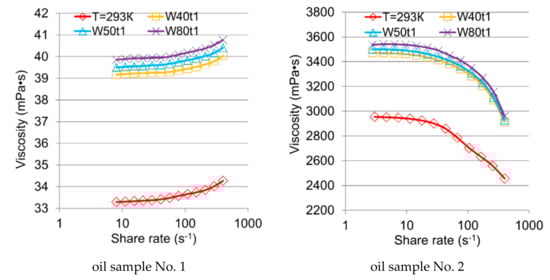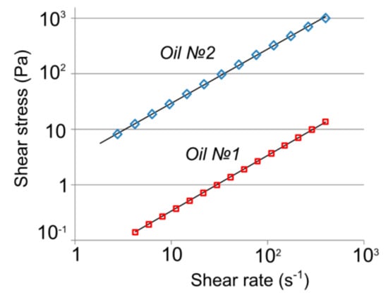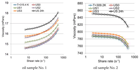 Duration of ultrasonic treatment was increased to 3 min. Treatment power was 80 W to avoid excessive evaporation of light fractions. The temperature of the oil sample No. 1 after treatment was 315.4 K and for the oil sample No. 2 it was 309.2 K. Figure 6 shows the obtained dependences of viscosities on the shear rate.