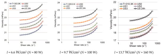 When treating the oil sample No. 1, the temperature reached 303.9 K, 305.9 K, and 310.3 K at the intensity of 6.65 W/cm2, 9.75 W/cm2, and 13.76 W/cm2, respectively. Comparison of viscosity curves as a function of shear rate after ultrasonic and heat treatment showed that a decrease in the viscosity of the oil sample was achieved by increasing the temperature.