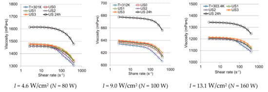 The influence of ultrasonic treatment on the viscosity of oil samples No. 1 and No. 2 was studied for processing for 1 min. The power of ultrasonic treatment was varied: 80 W, 100 W, and 160 W. Figure 4 and Figure 5 show the results. Here, US0 is the dependence of viscosity on shear rate, plotted directly after ultrasonic treatment, US1—after 1 h, US2—after 2 h, US3—after three hours, US 24h—one day after ultrasonic treatment. The influence of heat treatment on the oil viscosity at the temperature reached during ultrasonic treatment of samples was studied.