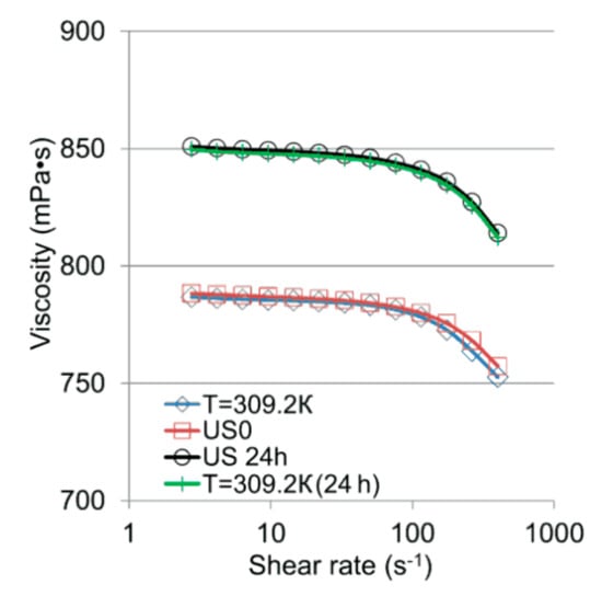 Previously (Figure 4, Figure 5, Figure 6), it was found that the viscosity of the oil treated by ultrasound increases after 24 h. For oil sample No. 2 (Figure 7), the viscosity curves obtained 24 h after thermal and ultrasonic treatment were compared (4.6 W/cm2, ∆t = 3 min).