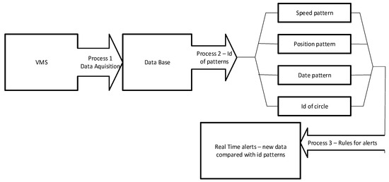 - Process 2: Implements a mining processes to identify patterns on VMS data (speed, position, date, and course direction). Taking into account the data collection process periodicity (which is a configurable parameter), it is possible to identify patterns for: