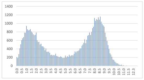 The histogram allows for the recognition of two different velocity patterns, identified by two distinct distributions that are visible when the data on the velocity of each of the vessels is graphically represented. The part of the distribution showing lower average speeds corresponds to fishing activity, and the other (higher) speed observations correspond to the movement of the vessel between the port and the fishing sites. So, it is needed to isolate the first distribution’s range to be able to classify the upcoming velocity’s as connected to fishing or not.