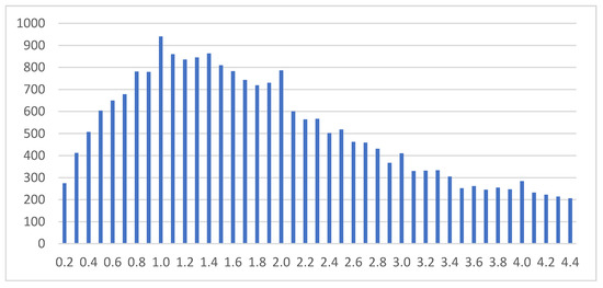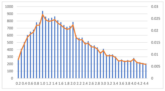Kernel: A Kernel distribution method was applied in the filtered histogram to have the distribution represented in orange in Figure 5. A dictionary with the velocities and the cumulative percentage of velocity was created. This led to a histogram such as the one shown in Figure 6 [23].