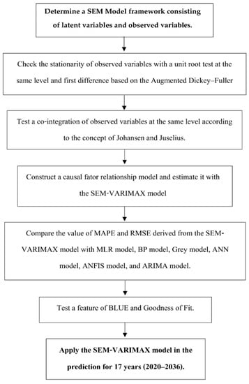 From the review of the relevant literature, it was found that the research patterns and methodologies varied in terms of the research process and the statistics used to create forecasting models. This study is distinct from others; it addresses a gap in the research while also developing the research process and pattern and applying advanced statistics. In addition to this, the authors conducted other studies to support the forecasting models with different indicators. Those studies are titled “The efficiency of long-term forecasting model on final energy consumption in Thailand’s petroleum industries sector: enriching the LT-ARIMAXS Model under a sustainability policy” [] and “A relational analysis model of the causal factors influencing CO2 in Thailand’s industrial sector under a sustainability policy adapting the VARIMAX-ECM Model” []. The mentioned studies used a stationary process, while adapting the concept of a co-integration and error correction mechanism in order to analyze the real impact of the indicators on the dependent variable. This research extends and develops the above studies in depth using a model with improved accuracy by optimizing the advantages of those studies. From those advantages, this study analyzes direct and indirect effects, and it adjusts each latent variable toward equilibrium. The output can be used as a tool to formulate future national policies and plans. Furthermore, this study aims to create new knowledge and act as a guide for research and education. Importantly, this study features a model that is applicable to various sectors and contexts, and it was developed with the aim of producing efficient and effective study outcomes. As mentioned earlier, this study applied advanced statistics in a proper context to make the model applicable to different sectors. As a whole, this construct is called “Structural Equation Modeling-Vector Autoregressive with Exogeneous Variables Model” (SEM-VARIMAX Model). The research also utilizes Linear Structural Relations (LISREL) [] software along with Econometric Views (EVIEWS) [,]. The above-mentioned model is assessed in term of its Model Validity and Best Modelling, as well as “Best Linear Unbiased Estimated (BLUE) assessment. This is to ensure that there will be no issues of Heteroskedasticity, Multicollinearity, and Autocorrelation. Once the complete model is obtained, it is then deployed to analyze the future trend together with qualitative analysis. The Model Validity Test is done through Triangulation. The research flow is explained below, as shown in Figure 1.