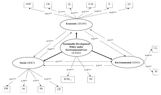 Figure 2 shows the impact of the causal factor relationship in the SEM-VARIMAX model determined by Sustainable development policy under environmental law , where the latent variables are: economic , social , and environmental ; the observed variables consist of energy consumption , per capita GDP , urbanization rate , industrial structure , net exports , indirect foreign investment , foreign tourists , employment , health and illness , social security , consumer protection , Carbon dioxide emissions , energy intensity , and error correction mechanism (). The study findings reveal which factors had direct and indirect effects, as can be seen in Table 3.