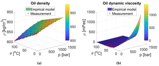(a) Dependence of the density on the pressure and temperature for the oil an ISO 46 viscosity grade; (b) dependence of the viscosity on the pressure and temperature for the oil an ISO 46 viscosity grade.