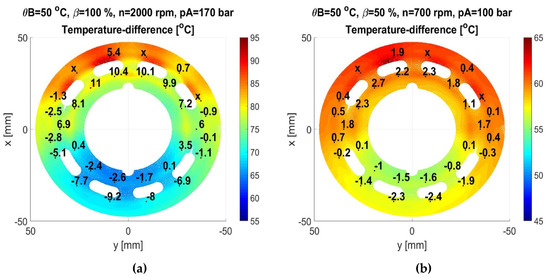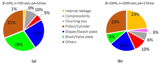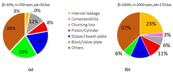 (a) Distribution of power losses at low power operating condition and θB = 50 °C; (b) distribution of power losses at high power operating condition and θB = 50 °C.