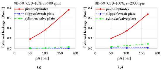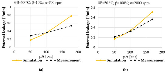 (a) Prediction vs. measurement; total external leakage of the pump at low power operating condition; (b) prediction vs. measurement; total external leakage of the pump at high power operating condition.