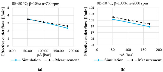 (a) Prediction vs. measurement; effective outlet flow of the pump at low power operating condition; (b) prediction vs. measurement; effective outlet flow of the pump at high power operating condition.